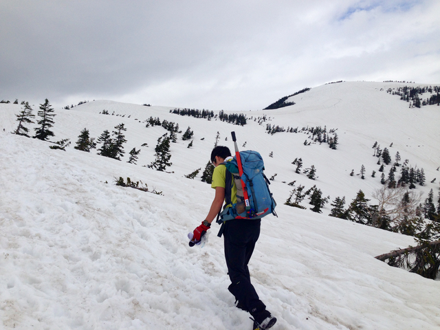 途中から雪が出てきますが、柔らかいのでアイゼンは装着せず。GW中の遊びと田植えの疲れのためか、案外上りが辛かったです。Cさんも二児の子育てで運動不足気味との事で、時折辛そうでした。
