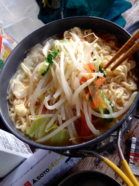 小屋に戻り、夕食は定番のサッポロ一番味噌ラーメン。宇都宮で買った餃子も投入し旅行気分を楽しみました。明日は”みんみん”に行こうと。自炊場でのおじさん方との会話もそこそこに、寝床での読書に移りました。そして、寝室でもおじさん方の百名山談義が始まったなー思ったら、いつの間にか寝ていました(19時くらい?)。