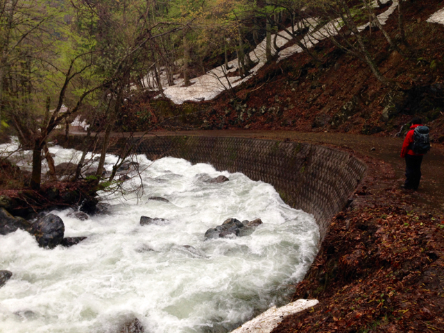 檜枝岐村には予定通り10時頃に到着。ささっと準備して沢沿いの道を登っていきます。さすがは日本有数の豪雪地帯、圧巻の水量でした