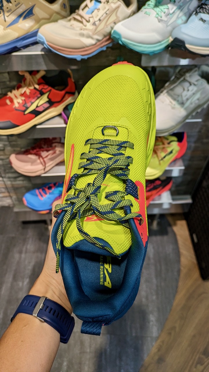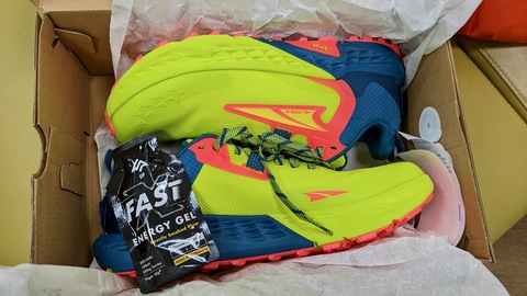 Hokaと悩んでモデルが新しく、トレラン的なイメージも強いAltraをチョイス。もうちょっと落ち着いた色が良かったですが、そこは在庫に決めてもらいました。