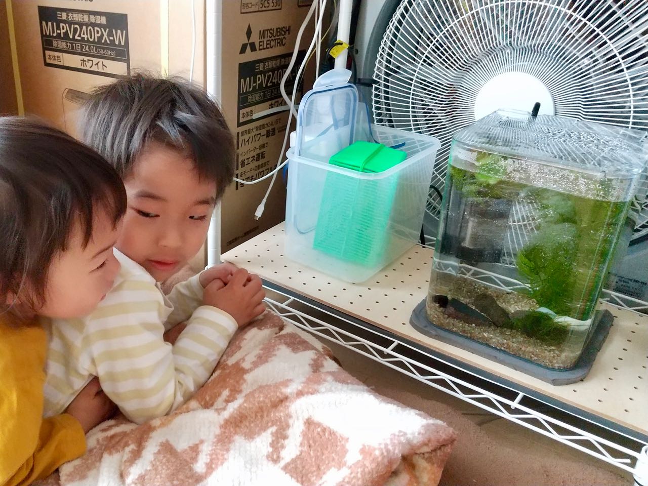 たまにシールちゃんエビ(息子が命名)を眺めている子供達を見て、水槽を置いて良かったなと感じるのでした。