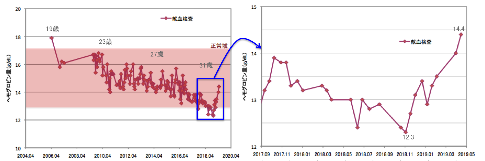 10年来減少傾向だったヘモグロビン量もなぜかV字回復中。