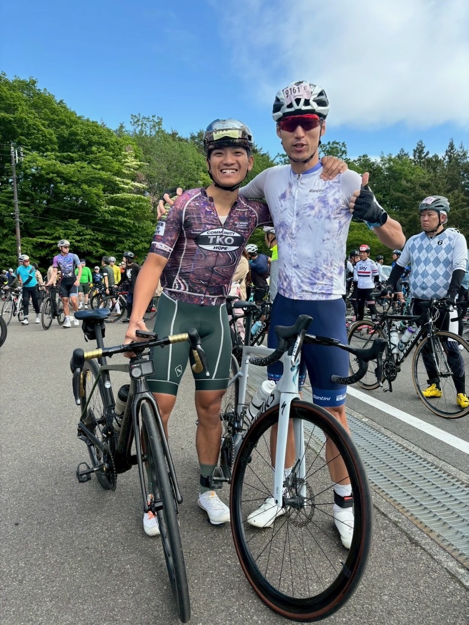 しばらくいくと、Dゼッケンの島根の大学生(Finish後に判明)がついて来てくれて、ところどころ交代しながら一緒にゴールまでいけました。大沢駐車場あたりからクロモリDAHONのタカタクさんも合流し3人でゴールを目指す展開へ。最後、ちょっと置いていかれましたが、Finish後に3人で健闘を称え合いました(3人ともシルバー)。