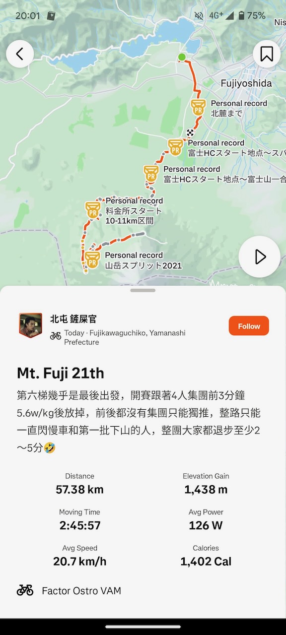 いざ、スタート。一合目までは斜度きつくて脚を使いがちと聞いていたので、300Wを超えないようにコントロール。それでも後ろに数人いたライダーがいなくなって、途中から単独になってしまいました。