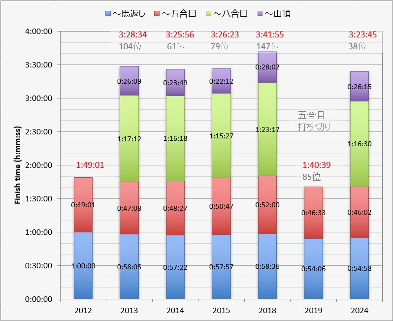 ここが課題残る区間, 26m15s。明らかに余裕がなくて、昔より追い込めていなかった。2015の22m12sは元気良過ぎた。 あまり山登り的な練習はやってこなかったので、その辺の筋力強化が次回への申し送り事項。