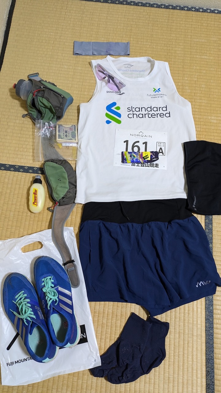 装備はこんな感じ。靴はどうせ痛むので、adizero takumi ren。台北マラソンで初めてSub3した思い出の靴です。いろんな気温と状況への対応ができる腹巻きはやはりmust。