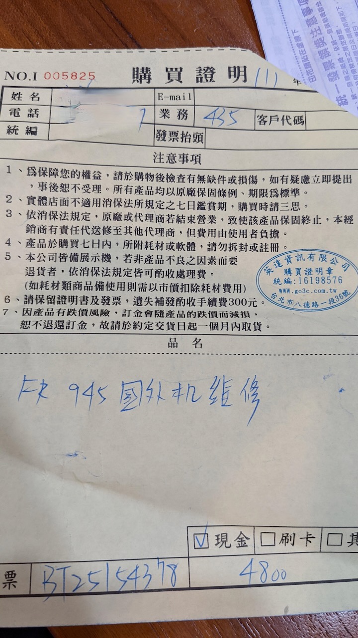 日本モデルだから対応できるかわからない、納期含めて工場に送ってからわかると微妙に脅されましたが、そこは怯まずGo。 費用は日本モデルということでリスト価格の倍の4800NTD(21600円)になりました。それでも日本での価格より十分に安い。