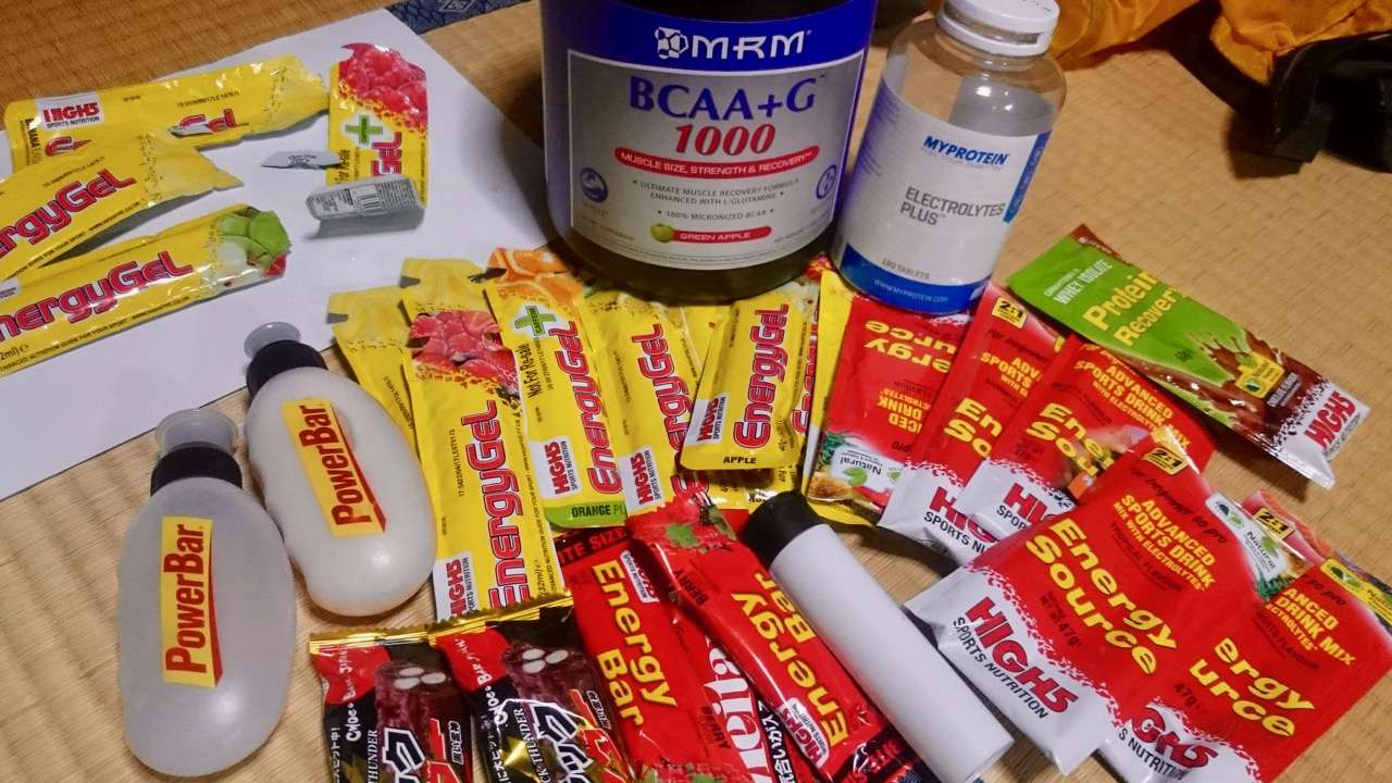 補給物資。High 5ジェルは粘度的に飲みやすくてGOOD。ジェルにBCAAを混ぜ込んだのも正解。電解質タブレットを車に忘れたのは痛かった(ドリンクに入れたパウダーのおかげなのか、攣ることはなかった)。