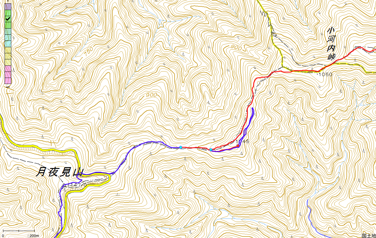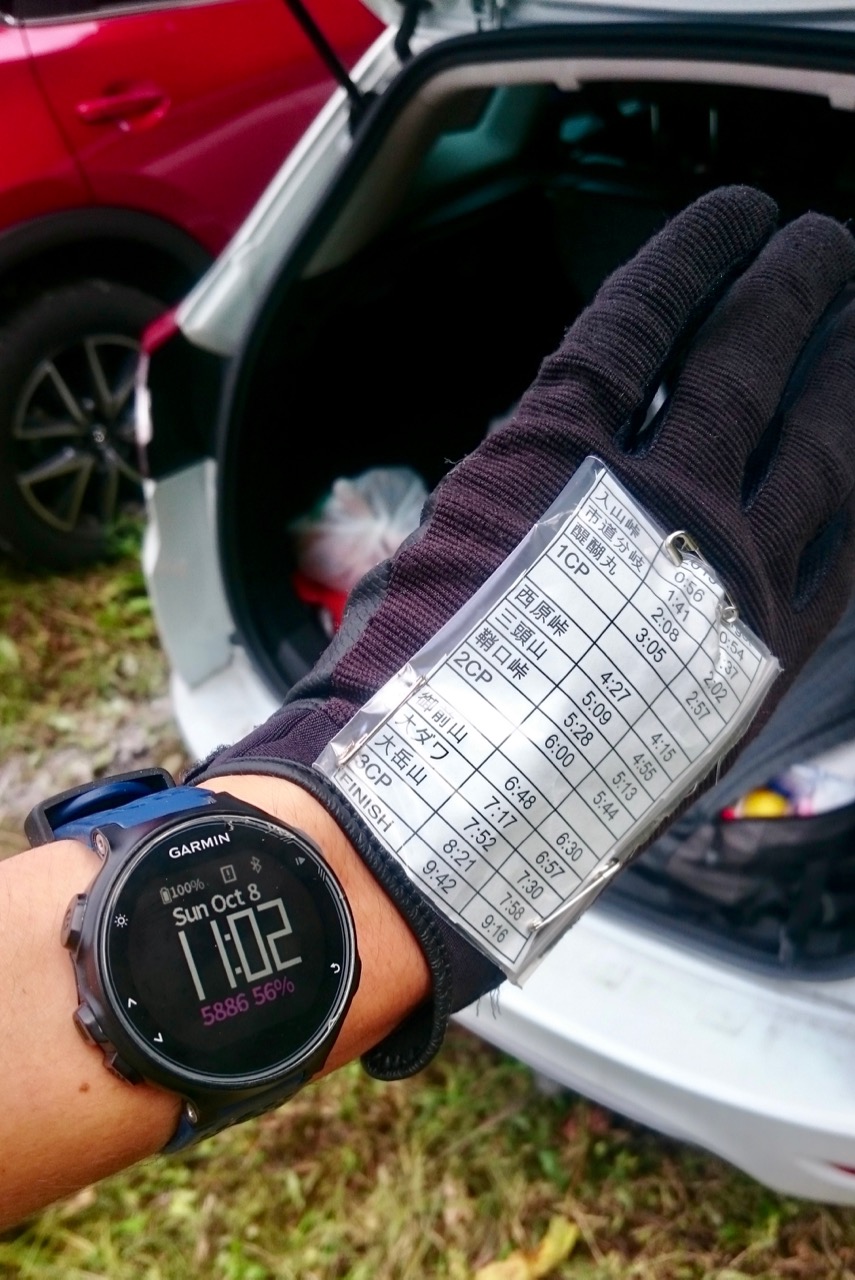 序盤はオーバーペースだったようで、O隊長や世界のO野さんよりも前を走っていた。しばらくは目標タイムを上回るペースで進むも、そのうち疲れてきて、CP1は前回とほぼ同じタイムで通過。徐々に前回タイムからも遅れだし、三頭山への登りはかなりグロッキー。わざわざ仙台から来てリタイアはまずいので、なんとか月夜見(唯一の給水地点)を目指す。