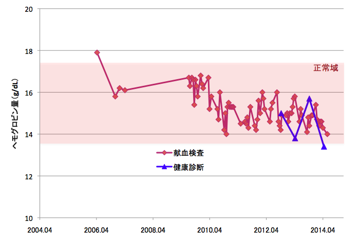 貧血 献血 X Facebook はてブ Pocket LINE コピー 2014.06.082025.02.01 4月の健康診断で貧血と指摘されてしまったので、過去のデータを整理。 直接的な原因は直前の400mL献血だと思いますが、そもそもヘモグロビン量が右肩下がりでした。赤血球数やヘマトクリットも同様な傾向。老化??(;´Д`) パフォーマンスを上げるためにも血を育てねば!!