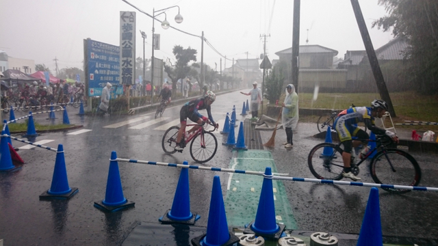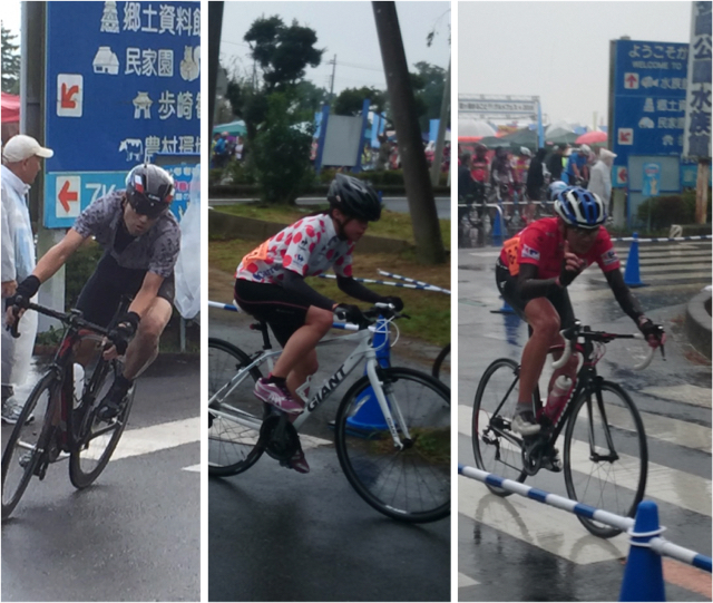 Mチーム第一走者は私。昨年同様、後方の位置からのスタートになってしまい、最後まで先頭集団を見る事すらかなわず。あと1周で交代の8周目、雨が降り始めてきた頃?、上り坂手前のコーナーで落車(一緒に落車した一名の方、ごめんなさい)。幸い、バイク、体ともにダメージは軽微、すぐに早い人と合流できたのでロス1分でMさんに交代。