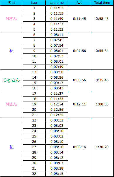 女性のMさんは二回出走で計10周走れてるので大したものだなと(練習もしてたらしい)。私も次回はコンスタントに7分40秒台とかで回れるよう鍛えないといけません。C-giさんも万全の体調・機材で臨んでくれると思います。