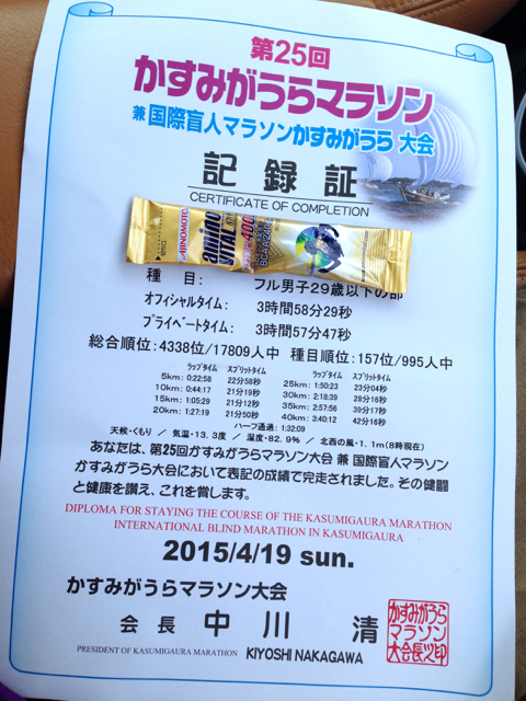 なんとかお腹の調子を戻そうと、ただの水をガブ飲みしたり(胃の内容物が濃すぎる場合には大抵これで治る)、フルーツを食べてみたり、マラソン大会中としては初となる自販機でジュースを買ってみたりしましたが、結局回復せず。最後、サブ4のために少しだけ走ったら、ゴール後に嘔吐する始末で散々でした。ちなみに吐出物というか液は、炭酸飲料MATCHみたいな透明色で、酸味は全くなく、ひどく甘かったです。やはり濃すぎた(浸透圧が高すぎた)??