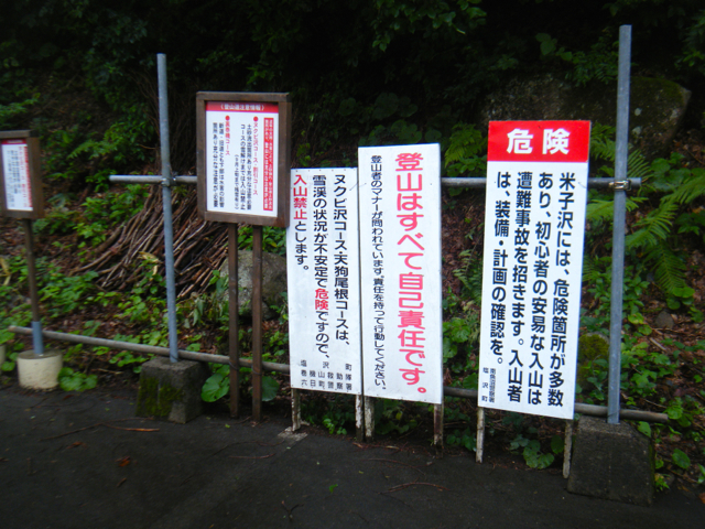 金曜の深夜に車で出発し、一般道で新潟へ。Cさんとは7時過ぎに越後湯沢駅で合流、登山口に向かいました。テキトーに準備を済ませ、物騒な看板を脇目に、スタンダードな登山道へ進みました。