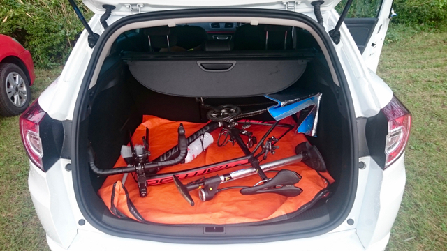 後部座席を倒さずに、ロードバイク(size:54,前後輪外し)を積むことができました。ステーションワゴン万歳。