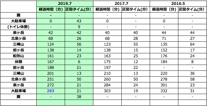 区間ラップ。特に急いではなかったのですが、登りが良くて、いくつかの区間で一昨年より速いタイム。そこそこロングコースですが、余裕をもってこなせました。駐車場からの往復区間で、一昨年(→こちら)より10分早い4時間53分でした。