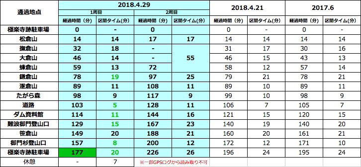 緑字は前回より2分以上早い区間。とりあえず最初の6薬師(+1)は会心の出来だと思ってたのですが、振り返ると実は前回と大差なし。後半のロードに余裕が出た形になりました。