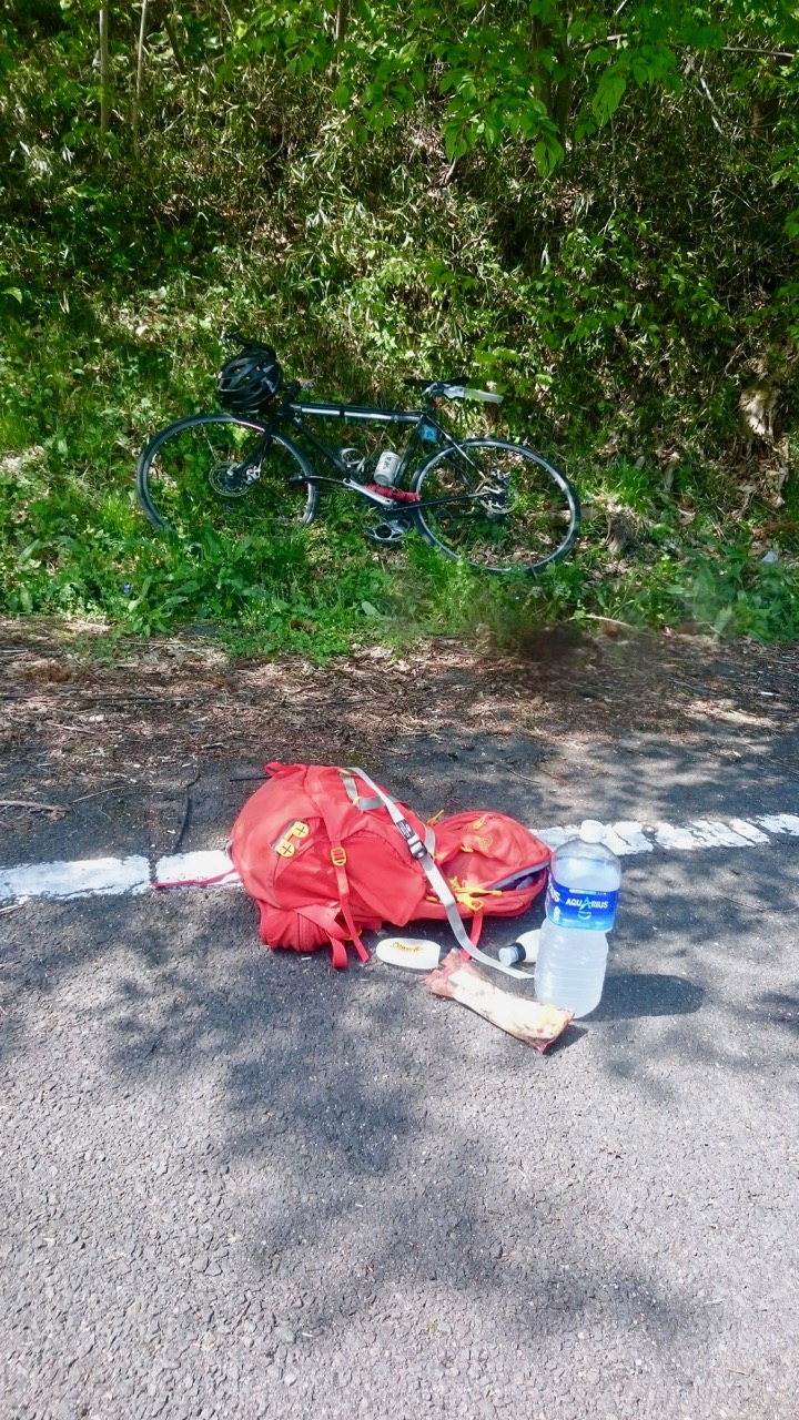 よほど調子悪くない限り2周するつもりだったので、近くのセブンで買った補給物資(ドリンクとパン)をスタート地点にデポ。相変わらず車なし生活中なので、アプローチは通勤号にて。