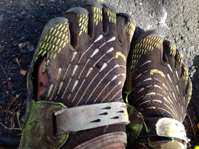 ゴール後。ギリギリもったビブラムFF seeya。そもそも相当ボロボロなので、新品で臨むつもりでしたが、米amazonからの配達が間に合いませんでした。問題の石コロ林道は、以前紹介した金属プレートで難無くクリア出来ました。薄いソールできちんと走りたいという人は対策が必要だと思います。