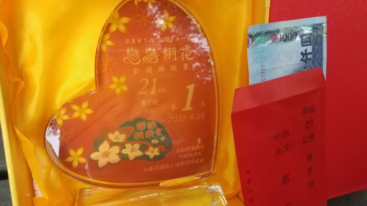新竹海洋マラソンからの連戦。見事に全体9位、クラス1位で賞金1000元ゲット!登るハーフとは相性が良いです。21.1km484mUP/1時間30分29秒 (ログ→strava)