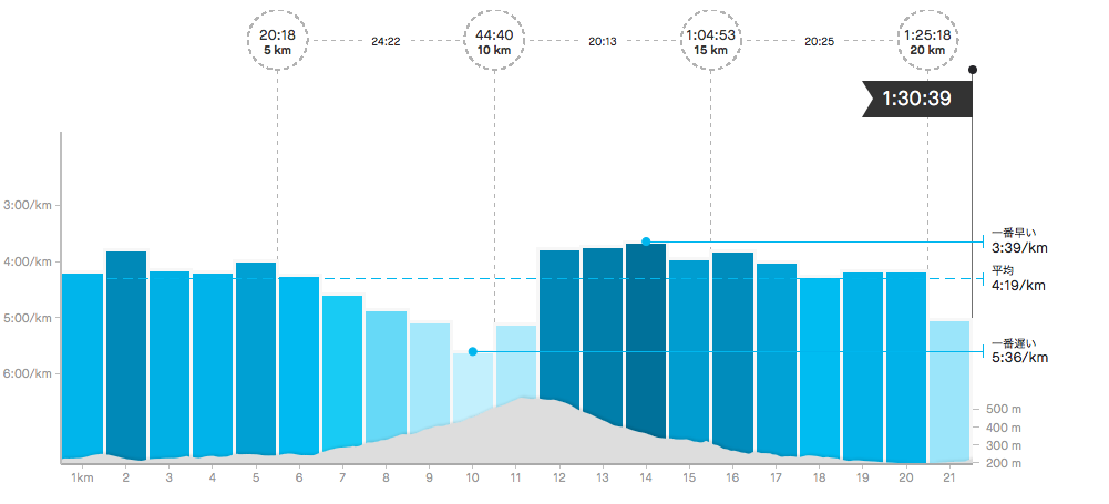 スタートから一桁くらいの順位で淡々と。心拍数は180超えているけど、ハーフならいけるという読み。内湾の先で折り返したら急坂区間へ。登りでは2人くらい抜いたような。