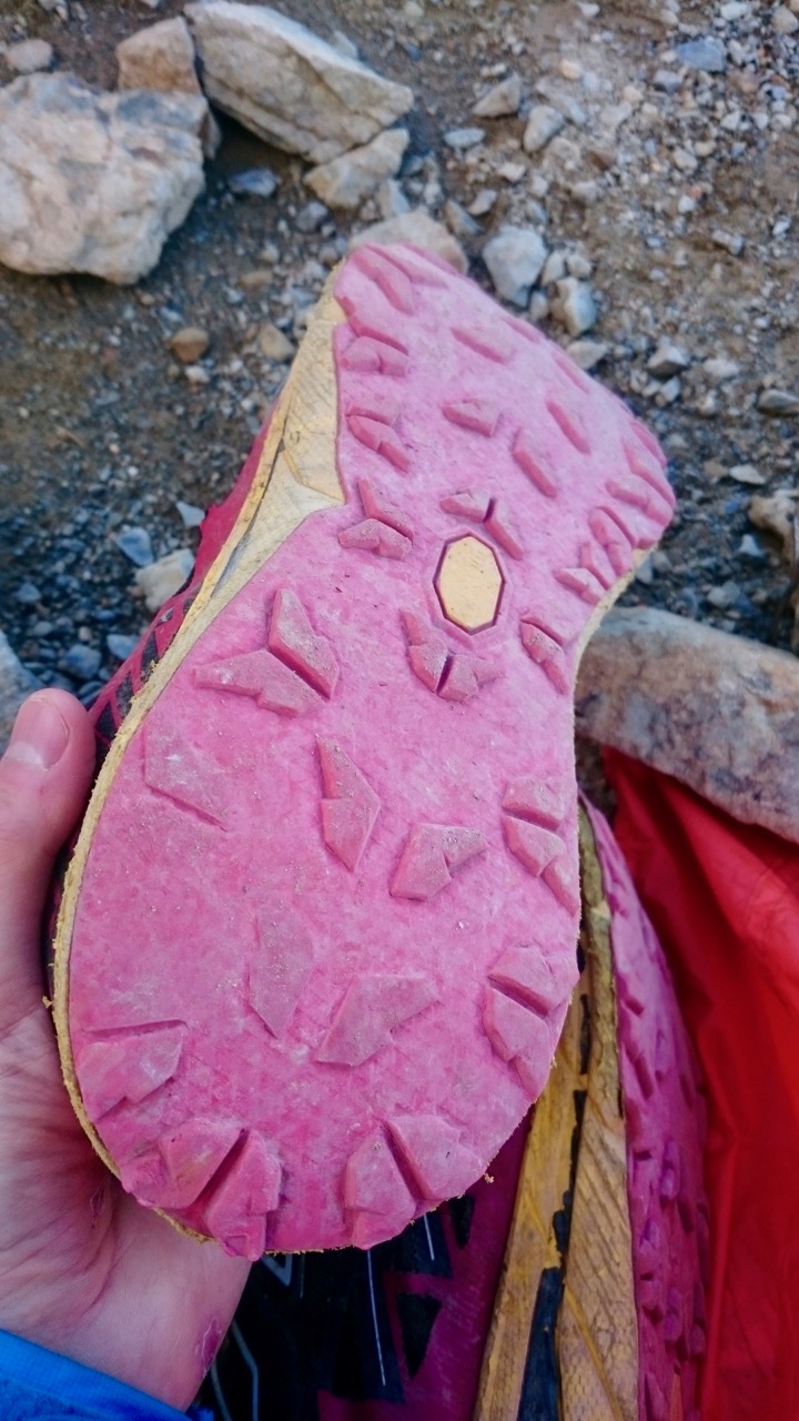 改めて見ると、やはりソールが減っていた。岩がソールに食い込む場面では平気だけど、土や砂の路面ではかなり滑った。