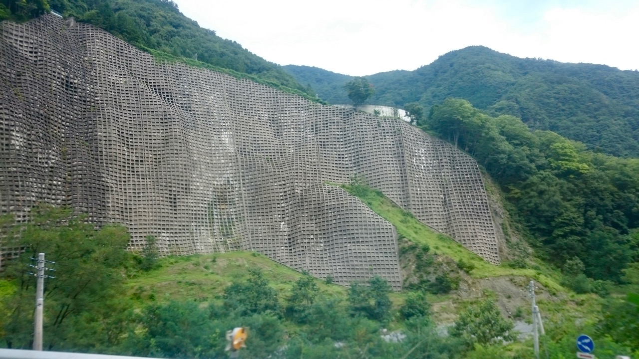 御勅使川沿いの巨大法面。圧巻。