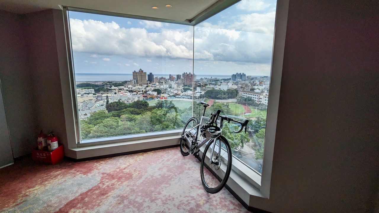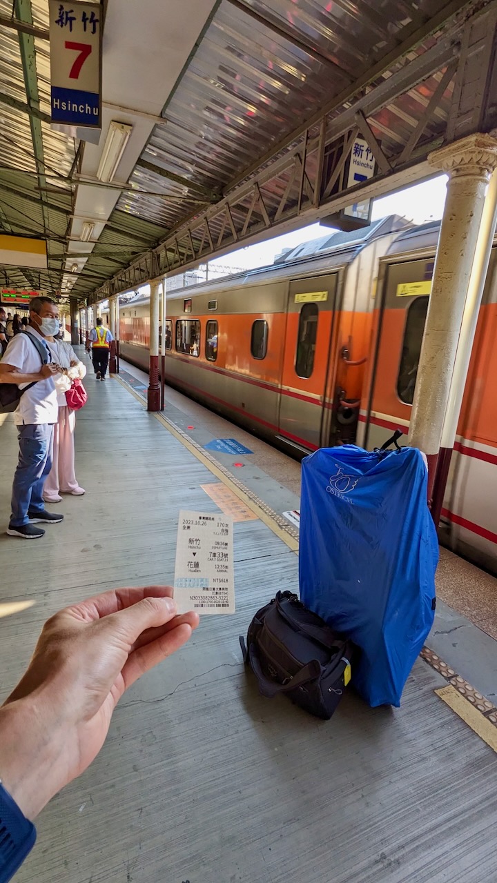 輪行は安定のホイールバッグ活用。フレームの傷を気にしなくて良いのでおすすめです。北新竹までは徒歩で10分、そこから鈍行で新竹駅へ移動し、同僚と待ち合わせて特急に乗りました。