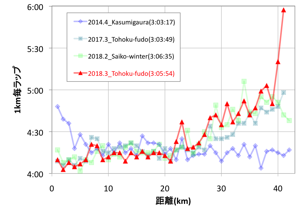 3時間5分54秒。ほぼ例年通りの出来だったけど、最後2kmがボロボロで2分落とした感じ。