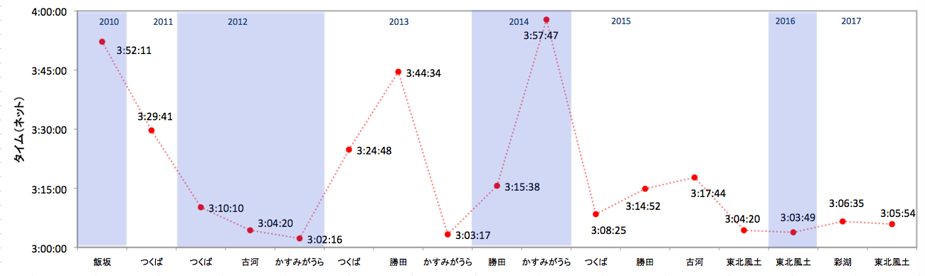 トレンド。ほどほどの練習量の貧血ランナーとしてはそこそこなところで安定してるかと。来シーズンはいわきあたりチャレンジしてみたいです。