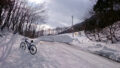 林道の積雪は多くても15cm程度でしたが、非常に重い雪で全然進まず、ほどよい下りでも雪の下の凍った轍にハンドルをとられまくる始末で、乗車率は散々でした。まぁ少しは乗れたのでOKかと。ということで、旗坂キャンプ場でギブアップ。