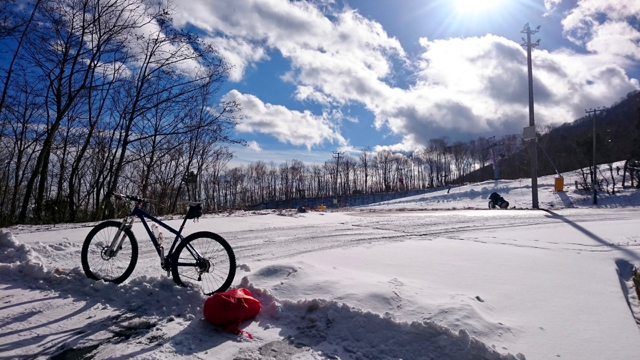 二週間前よりも随分雪が減っていました。賑わうゲレンデを横目に林道セクションへ。目的地は大滝キャンプ場。