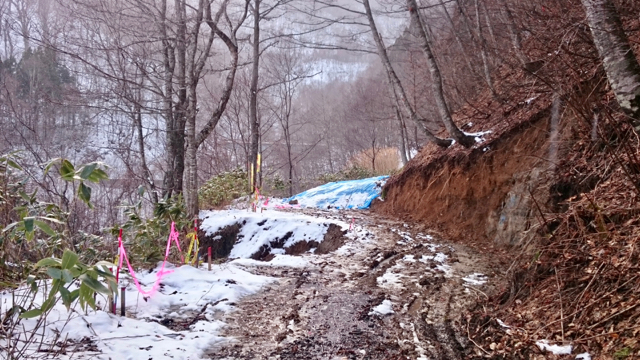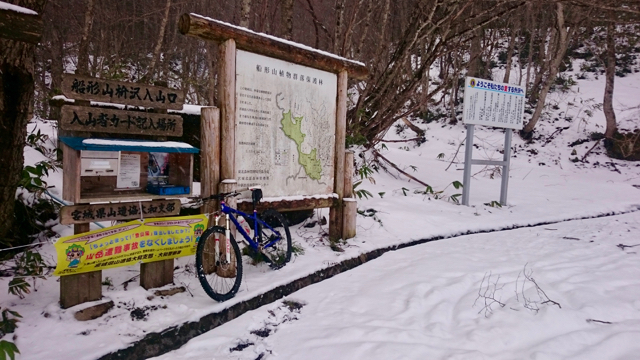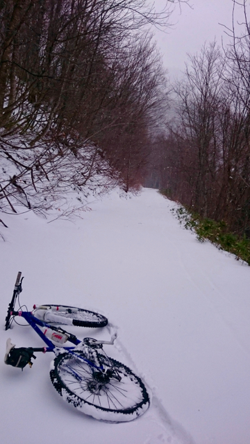 林道の積雪は多くても15cm程度でしたが、非常に重い雪で全然進まず、ほどよい下りでも雪の下の凍った轍にハンドルをとられまくる始末で、乗車率は散々でした。まぁ少しは乗れたのでOKかと。ということで、旗坂キャンプ場でギブアップ。