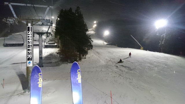 夕方18時くらいに二度目の帰宅。林道押し歩きと、故障ペダルライドで本当にヘロヘロ。しかし、初滑りはやっておきたかったのでスプリングバレーのナイター(ラスト券:2000円)へ。